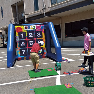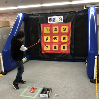 スナッグゴルフもコースプレーとなると、かなりのスペースが必要となる。スナッグアウトなら、屋内のスペースでもプレー可能です。